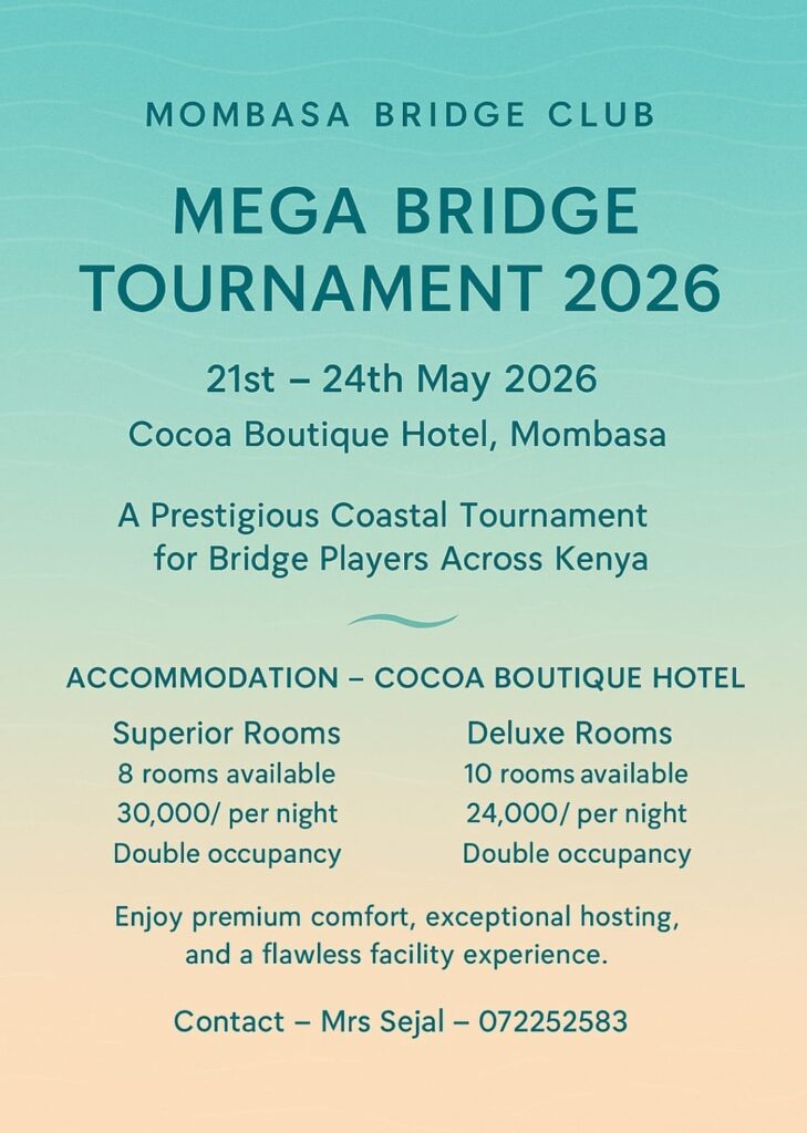 OTHER CLUBS Nairobi Gymkhana – Every Sunday. Starts at 9.30am. All are welcome. For further information contact Ashwin Shah 0733600951 OSHWAL GAMES RESULTS Valentine Bridge Results